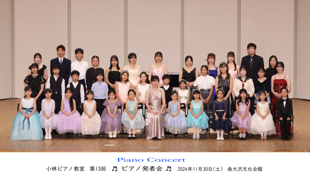 2024年11月30日(土) 第13回 小林ピアノ教室 発表会(南大沢文化会館 主ホール) ここ数年使用している会場が改装中の為、今年度は少し特別に例年よりも立派なホールでの開催となりました。舞台の広さや客席数も倍近く、とても大きな会場でした… -